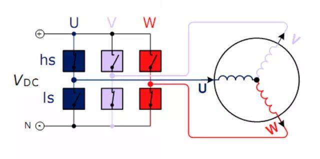 典型的三相电机驱动PWM是互补型的,即一组信号的上下两个波形的状态是相反的,分别控制这组桥臂上下两个开关管的状态,避免同时导通造成短路,见图7。