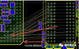 B、误差控制,差分对对内误差尽量控制在5mil以内;数据线组内误差尽量控制在+-25mil以内,组间误差尽量控制在+-50mil以内。