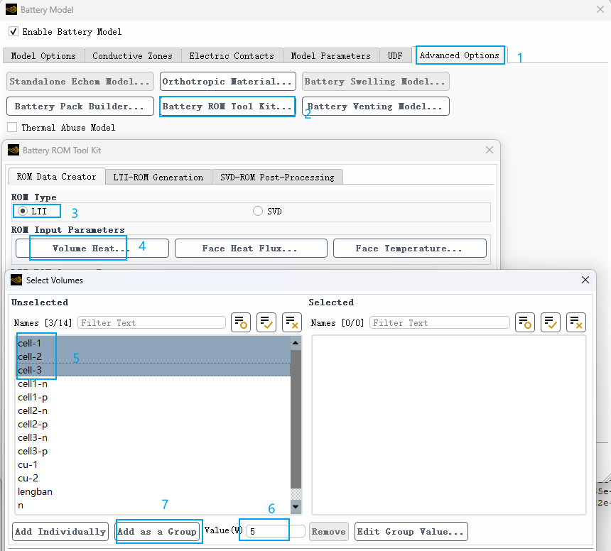 8,设置ROM时的输入参数,按照我们仿真的目的把电池热源作为输入之一,给个5w。由于每个电芯热源一样所以选择add as a group。
