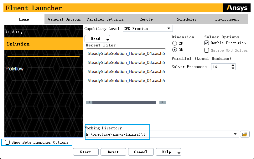 1,启动fluent模型,需要取消上次勾选Python Console,并保证准备的文件在所打开的工作文件夹内