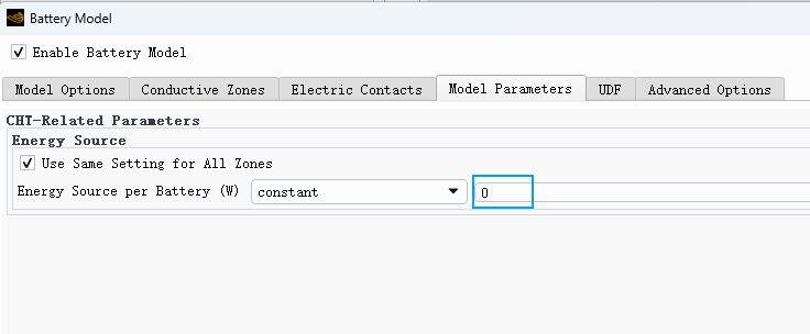 5,将电池发热设置成0,这里原因比较复杂,就是LTI本质是一种卷积理论的计算,需要脉冲激励来学习生成变热源的热特性。(详细的理论如果感兴趣可留言,视情况我们单独聊一篇章)