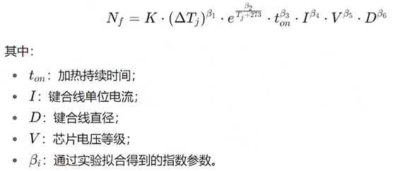 在对数坐标下(log (Nf) – log (ΔTj) 图),该模型呈线性关系,但 LESIT 模型未区分不同的失效机制(键合线与焊层),因此只能代表混合失效模式下的平均统计结果。