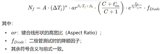 德国INFINEON公司在CIPS项目中(Bayerer等人)提出了更复杂的经验寿命模型,即著名的 CIPS2008 模型。该模型在 LESIT 基础上增加了多项影响因素,包括通流电流、加热时间、键合线直径及芯片电压等级等: