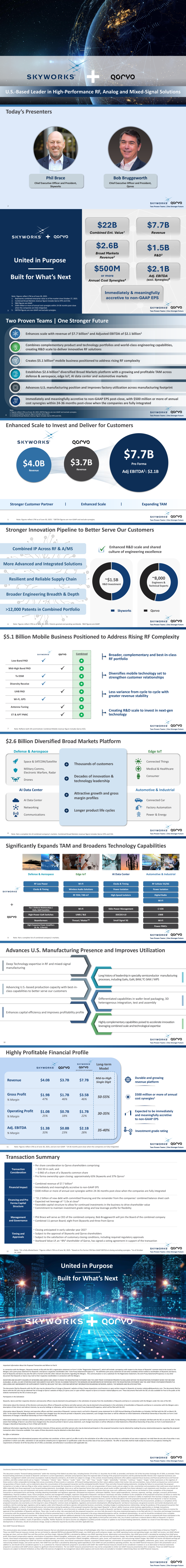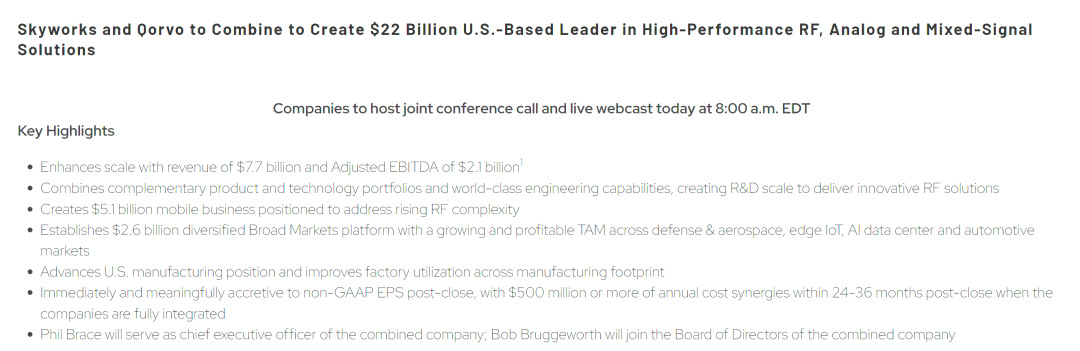 从交易细节看,此次合并溢价显著:Qorvo股东每股将获得32.50美元现金及0.960股Skyworks股票,交易总对价较Qorvo前一日收盘价溢价14.3%。合并后,Skyworks股东将持有约63%股份,主导新公司运营,其CEO菲尔·布雷斯将出任新CEO,Qorvo CEO则加入董事会,交易预计2027年初完成,当然,跨国公司的合并必然要经过所在国的反垄断审批,尤其是对于处于优势地位的企业来说。