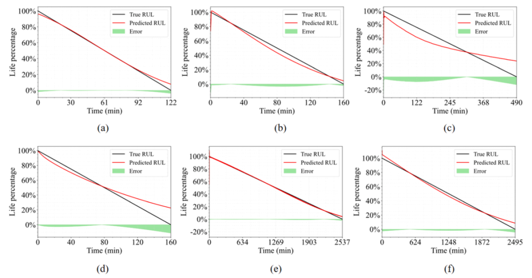 为验证所提方法的有效性,我们将其与多项先进预测方法进行对比。TCN-GRU[42]融合了时间卷积网络的并行计算能力与门控循环单元的强大学习能力,并整合了注意力机制。CTLS[43]则通过整合卷积神经网络、Transformer、神经网络架构(LSTM)以及平滑半鞅随机层,显著提升了RUL预测的准确性。