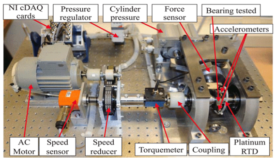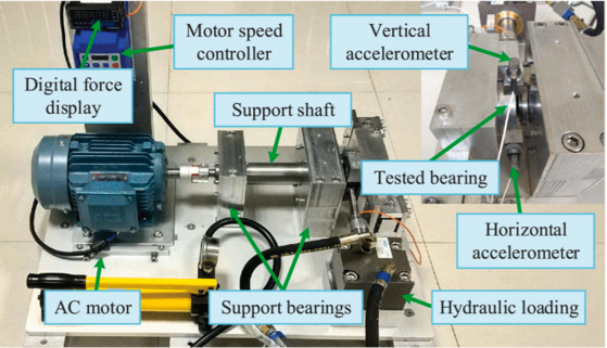 XJTU-SY数据集是由西安交通大学(XJTU)和浙江昌兴益阳科技有限公司(SY)联合发起的项目,为轴承研究提供了全面的资源。如图4所示,实验装置包含交流电机、旋转轴、速度控制单元、液压加载机构、支撑轴承以及测试轴承本身。该平台支持在不同运行场景下对滚动轴承进行加速老化测试,并收集大量生命周期数据。关键可调参数包括由液压系统作用于测试轴承壳体产生的径向载荷,以及通过交流电机控制器调节的转速。
