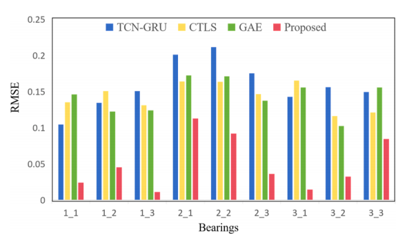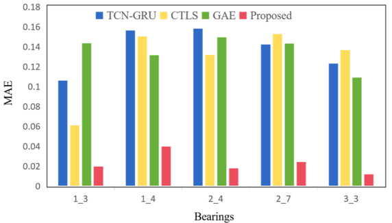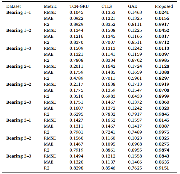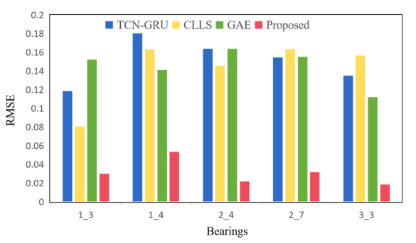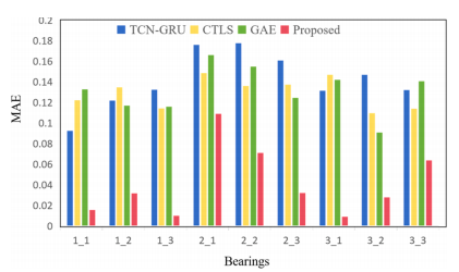 本研究将所提出方法的性能与TCNGRU、CTLS、GAE进行对比。采用Adam优化器,学习率设为0.001,训练过程持续200个周期。表7展示了该方法与替代方案的对比结果。数据显示,所提方法在保持较低RMSE和MAE的同时,显著提升了R²指标。以轴承1-2和轴承1-3为例,该方法分别实现了0.0452和0.0113的RMSE,以及0.9712和0.9985的R²,明显优于其他方法。这表明该模型在相对稳定的劣化过程中具有强大的拟合能力。在轴承2-1、轴承2-2等相对复杂的子数据集上,虽然整体误差略有上升,但所提出的方法仍以显著优势持续超越基准方法,展现出良好的鲁棒性和泛化能力。图9展示了部分实验组的预测曲线及误差数据。图11和图12分别呈现RMSE和MAE指标,对比了所提方法与其他模型在所有测试集上的表现。这些结果充分证明了该方法在预测能力上的优越性。