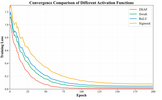 为评估DSAF的收敛特性,我们在XJTU-SY数据集(数据集1-3)上将其训练性能与ReLU、Swish和Sigmoid进行对比。图13展示了训练损失曲线,结果显示DSAF不仅收敛速度更快,最终损失值也更低。DSAF的优异收敛性主要得益于其注意力机制——该机制能自适应地对退化相关特征进行加权,并通过平滑的Swish驱动梯度实现优化。