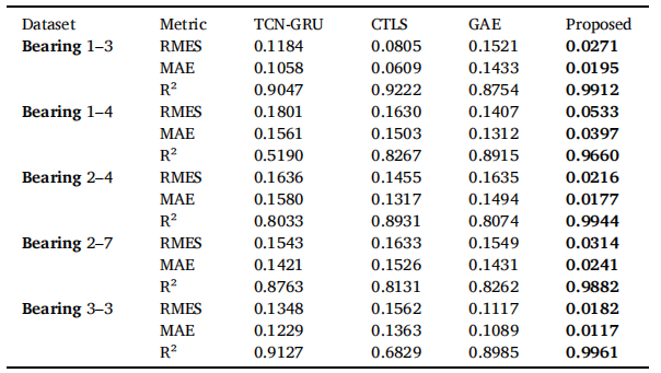 GCN技术的全局视角:捕捉不同时间窗口的广泛劣化模式,有效降低复杂工况建模误差。SplineCNN的局部精度:模拟平滑劣化趋势,减少GCN离散聚合固有的离散化误差。GRU的时序一致性:使预测结果与退化过程的时序演变保持一致,提升物理一致性。