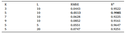 表13展示了K取值为{3,5,7,9}时,滑动窗口长度L分别为5、10和20个时间步长的实验结果。当K=5时,DDSGNet模型取得了RMSE=0.0175和R²=0.9964的优异表现,显著优于K=3(RMSE=0.0443,R²=0.9522)因邻域连接性不足的情况,以及K=9(RMSE=0.0852,R²=0.9161)因引入远邻噪声的影响。采用10个时间步长的时序窗口能实现最佳性能,这种设置在时间分辨率与特征稳定性之间找到了平衡点。相较于仅捕捉信号变化不足的5步长窗口,以及过度平滑关键退化趋势的20步长窗口,该时序窗口方案展现出更优的性能表现。这些结果证实,K=5和L=10是建模轴承退化模式的理想参数。在测试训练相关参数时,我们评估了学习率({0.0005,0.001,0.005})和批量大小({16,32,64})的影响。0.001的学习率找到了最佳平衡点,不仅使RMSE值最低,还实现了最高的R²值;而0.0005会导致收敛速度变慢,0.005则会使训练过程不稳定。32的批量大小被认定为最优选择,相比16的批量大小会引入更多噪声,而64的批量大小则会降低更新频率。最终我们选择了最优配置(K=5,L=10,学习率=0.001,批量大小=32),该配置在验证集上观测到的RMSE值最低。