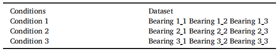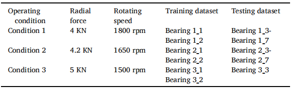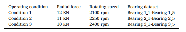 为完整记录轴承的振动信号全生命周期,我们采用磁性基座将两个PCB352C33单向加速度传感器分别安装在测试轴承的水平轴和垂直轴上。实验中使用DT9837便携式动态信号采集器进行振动信号采集,采样参数设置为:采样频率25.6千赫兹、采样间隔1分钟、每次采样持续1.28秒。当振动信号振幅超过初始值十倍时,表明轴承已完全停止工作,此时终止测试。由于载荷作用方向为水平,该平面的振动信号能更直观地反映劣化过程。本文采用水平振动信号进行分析研究。 该研究包含15组滚动轴承在三种不同工况下的全生命周期退化数据,数据分为训练集和测试集,分别用于模型训练和最终预测的准确性评估。表1展示了XJTU-SY的运行参数。