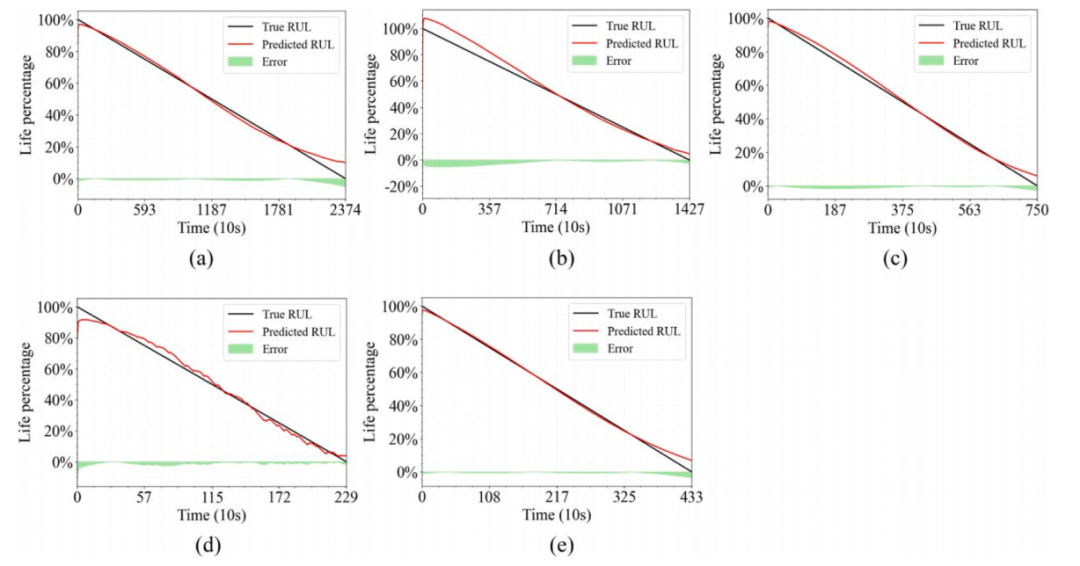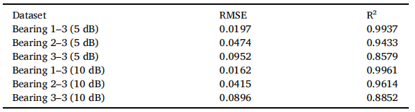 为评估系统在环境干扰下的鲁棒性,我们在XJTU-SY数据集上进行了噪声子集验证。该噪声子集通过在信噪比(SNR)为5 dB和10 dB的条件下添加高斯白噪声生成。表9展示了预测结果,结果显示与原始XJTU-SY相比,噪声子集下的RMSE值有适度提升,表明系统对噪声具有良好的泛化能力。