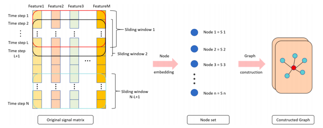 图3展示了图结构的构建过程。首先,我们采用滑动窗口技术对时间序列进行分段处理。具体来说,设置长度为10的窗口,并以1为步长在时间序列上滑动。每个窗口捕获的数据段被定义为图中的一个节点。在获得节点集 合后,我们使用KNN方法构建图结构。对于每个数据点 ,计算其与所有其他数据点的欧氏距离。假设数据集包含 个样本,每个数据点 是一个D维向量,欧氏距离可表示为:
