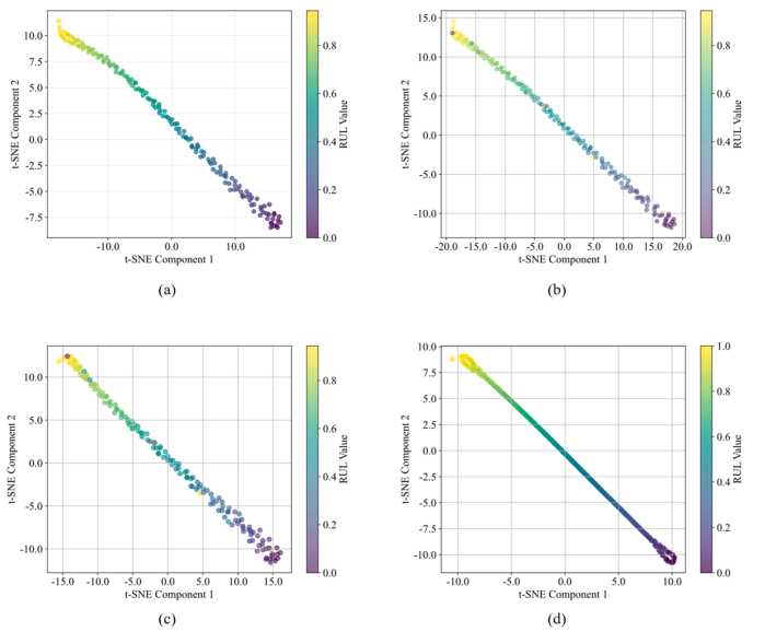为评估模型各组件对整体性能的贡献,我们开展了消融实验。通过系统性移除关键组件来探究其对模型性能的影响,具体细节见表8。为进一步分析各组件的作用,我们采用t-SNE对不同消融配置学习到的潜在特征嵌入进行可视化展示。如图12所示,完整的DDSGNet在整个退化过程中展现出平滑连续的嵌入轨迹,颜色从健康状态逐渐过渡到故障状态,这与RUL的缩短直接对应。当移除SplineCNN分支后,嵌入空间整体连贯性减弱,局部结构变得模糊不清,这表明其建模空间图拓扑信息的能力有所下降。 当消除DSAF约束时,模型结构变得松散,表明其捕捉复杂模式的能力下降。移除物理约束后,嵌入分布呈现无序状态,颜色分布也出现断裂。这些发现证实,每个组件对于学习稳健且物理一致的表征以预测RUL都至关重要。