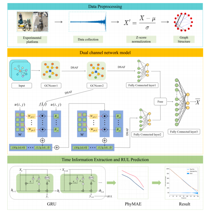 在工业系统预测性维护中,准确预测轴承剩余使用寿命(Remaining Useful Life, RUL)至关重要。然而传统方法往往难以捕捉振动数据中的动态拓扑变化和非线性退化规律。为解决这一难题,我们提出双通道动态样条图卷积网络(Dual-Channel Dynamic Spline Graph Convolutional Network, DDSGNet)。与依赖离散特征聚合的传统方法不同,本文通过全局拓扑聚合模块建模振动特征的空间相关性。连续局部演化算子捕捉静态退化的动态特征,而时间依赖学习器则保留长距离序列信息。该方法有效解决了连续局部特征变化建模的难题。创新性地提出DSAF激活函数,通过平滑梯度动态适应非线性信号变化,有效解决了梯度粗糙和梯度消失问题。同时引入基于物理约束的PhyMAE损失函数,精准匹配轴承退化特性,确保预测结果既准确又符合物理规律。实验表明,DDSGNet在两个公开数据集上的表现优于现有最优方法,为轴承剩余使用寿命预测提供了可靠解决方案。