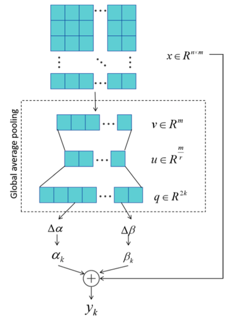 全局信息向量通过全连接层FC1压缩得到 ,其中 为压缩比。再通过全连接层FC2恢复维度,并分割为 个分段参数 ,其中 为分段数量。