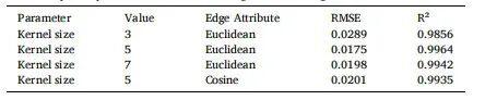 我们使用XJTU-SY数据集1-3对SplineCNN的核参数和边属性进行了敏感性分析。具体而言,针对核参数,我们考察了核尺寸的影响,将其设置为{3,5,7}三种不同值,同时保持其他参数不变。对于边属性,我们评估了不同距离度量方法的敏感性,比较了欧氏距离和余弦距离。分析结果详见表15,其中包含RMSE值和决定系数R²。