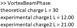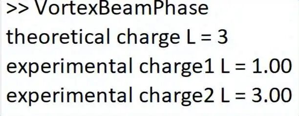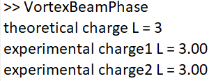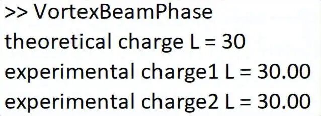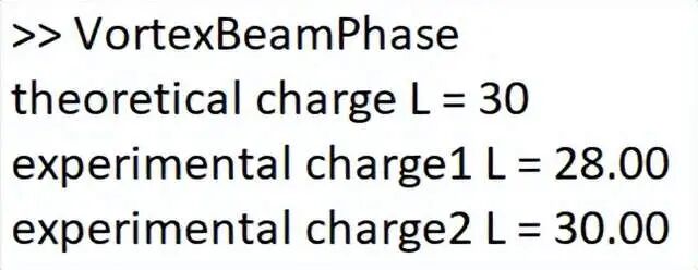 从上述涡旋超透镜相位分布可知,其相位实际上是普通透镜相位加载上涡旋光相位,这点符合开始讲述的SLM原理。该过程用专业术语描述就是调制,也就是相位相加。值得注意的是,我们使用的超透镜尺寸比较小,像素单数为45×45,分辨率较低。因此,在形成涡旋光束过程中相位分布不够精细,导致生成的涡旋光光束相位不够理想,提取的拓扑荷数存在误差。但是我们通过MATLAB代码计算更为精密的涡旋相位,其实验得到拓扑荷数与设计的拓扑荷数是一致的。
