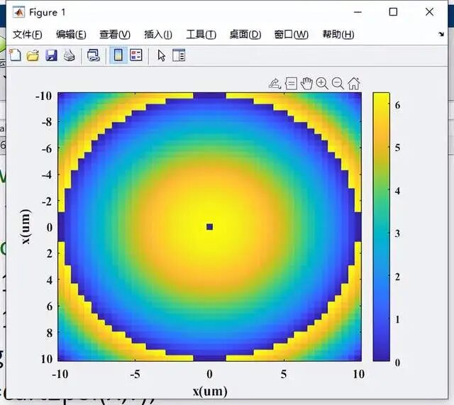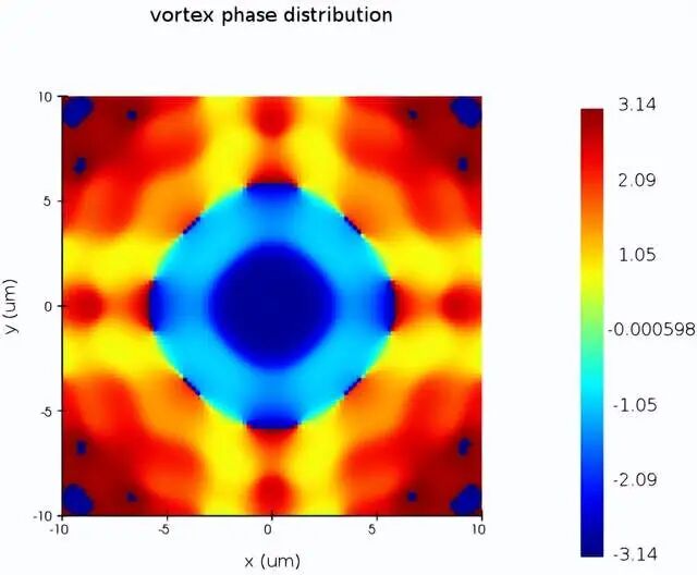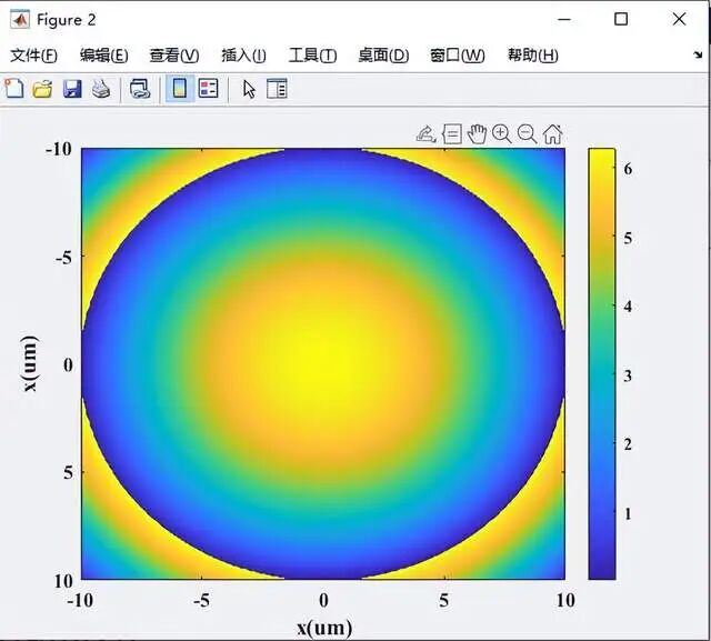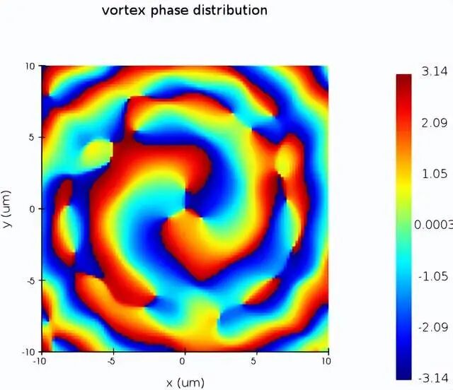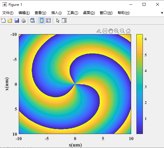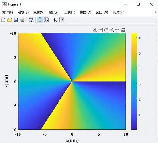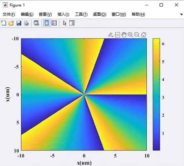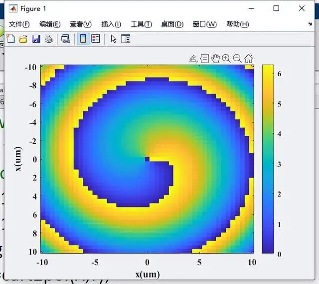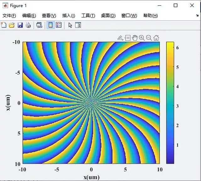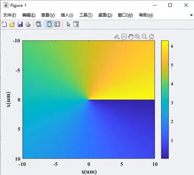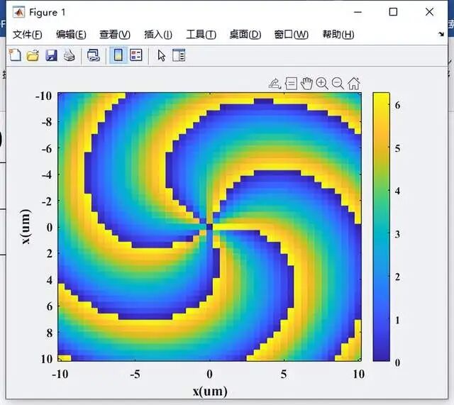 从该公式可以知道,所谓的涡旋超透镜实质是在普通聚焦超透镜的基础上加载上涡旋相位即可得到涡旋超透镜,这点与SLM的工作原理类似,也就是普通光束经过SLM调制后都可以得到相应的高阶光束。在MATLAB计算的涡旋出来的涡旋相位分布,满足0到2相位分布。