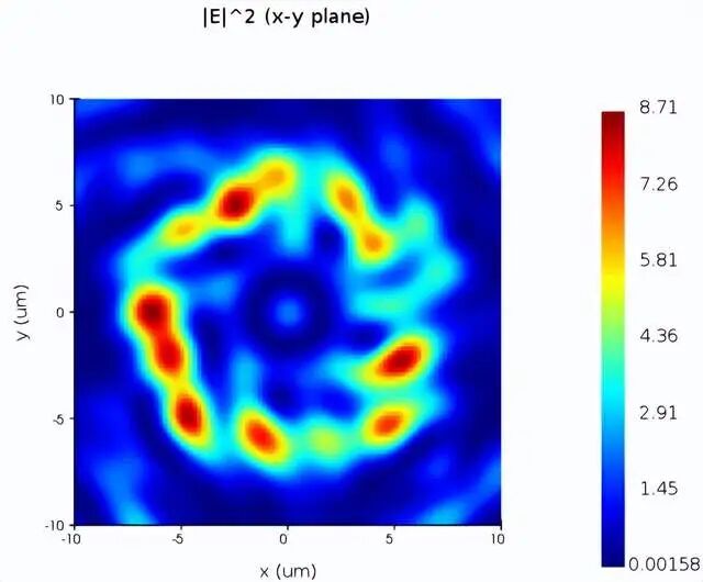 其中,涡旋相位,也可以表示为单元通过几何旋转而提供的PB相位。当然,本文使用的是圆形柱子,无法通过旋转得到涡旋相位,因而通过单元像素来匹配整体相位分布。如果使用方块柱子,则可以通过先根据超透镜聚焦所需要的相位排布,然后再通过几何旋转满足涡旋相位,也就是PB相位。