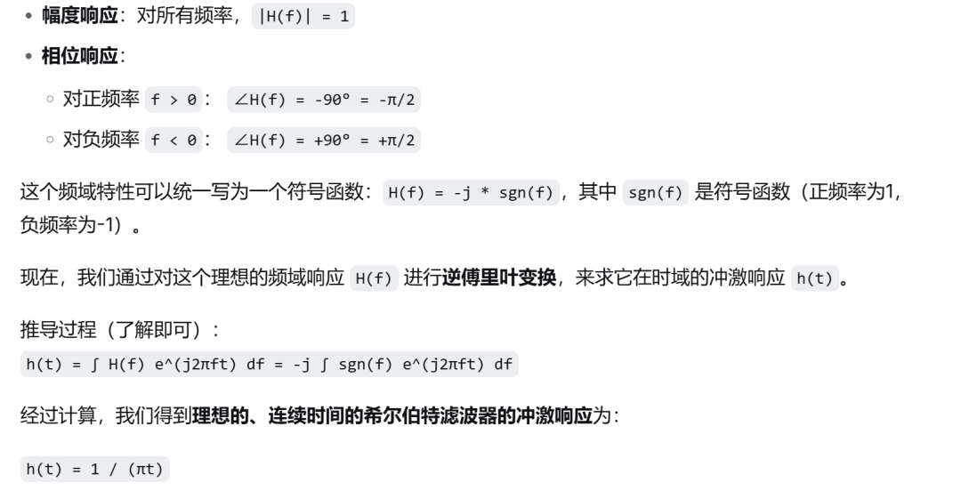 IIR实现方法不是去近似那个理想的冲激响应 h(t) = 1/(πt),而是直接去逼近希尔伯特滤波器的频率响应,即在一个关心的频带内,实现尽可能平坦的幅度响应和尽可能接近90度的相位差。