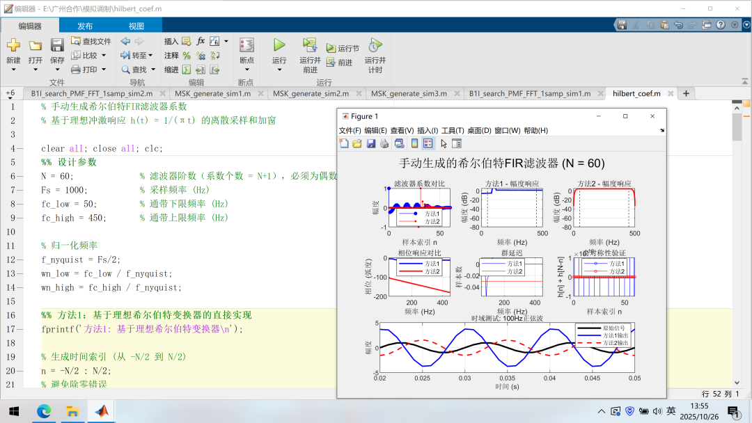 利用对称性:理想的希尔伯特响应是奇对称的,我们设计的FIR滤波器系数也保持这种奇对称性。这保证了滤波器在所有频率上都能提供非常接近 90° 的相移。