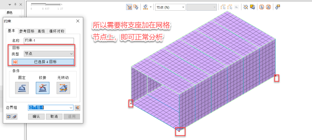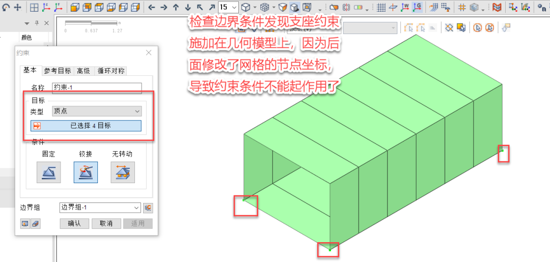 支座加载在几何模型上的话,是不会随着网格的变化而变化的,它就固定在那个坐标位置上了,所以导致后来的网格组没有约束。