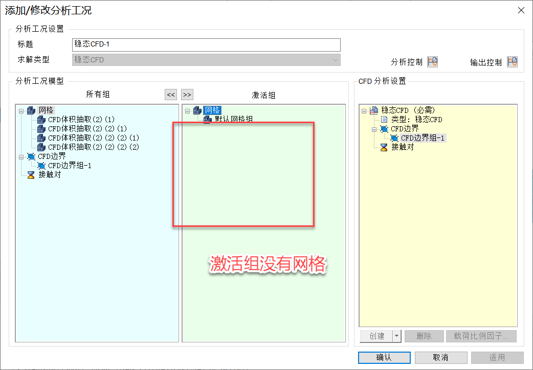 4、 分析工况中没有把网格组放到激活组!(删除网格重新划分后,需要重新拖放。)