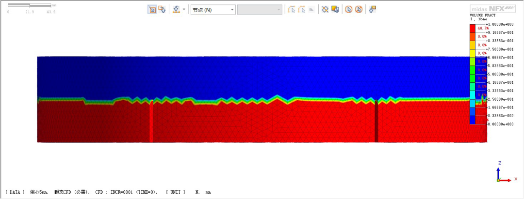 答:假如初始液面坐标为10m,但是划分网格后,并不是所有网格节点坐标一定在10m的位置,所以要想初始液面平齐,必须在几何模型上在10m的位置上印刻一下(或者分割实体),然后再划分网格。