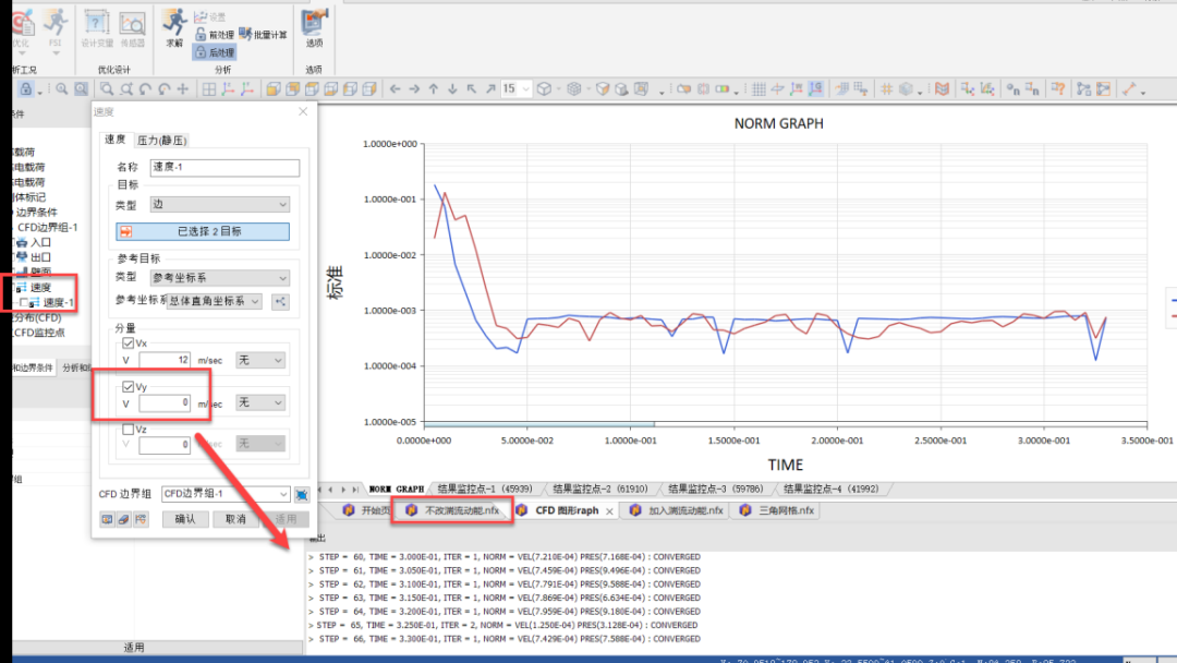 边界条件“速度”中Vy勾选为0,结果收敛:
