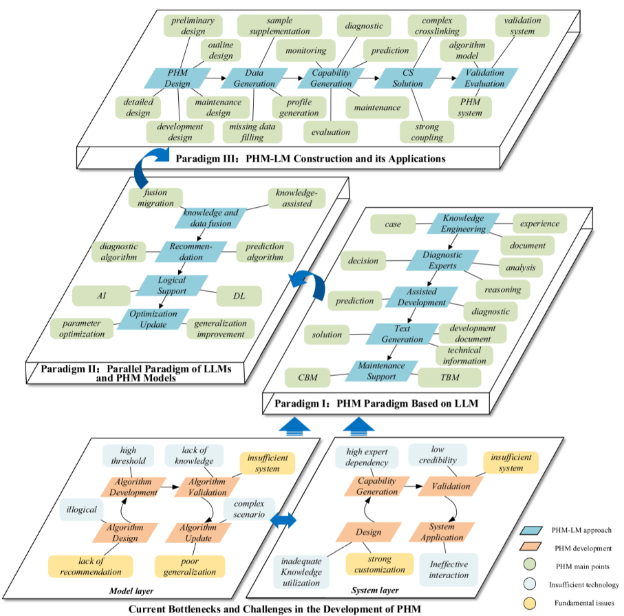本文基于大模型与健康管理结合研究的现实需求,结合大模型技术优势、健康管理系统全寿命周期的系统工程过程、健康管理面临的问题,在系统梳理当前PHM存在的瓶颈与挑战、深入分析大模型技术的优势等基础上,创新性地提出了健康管理大模型(PHM-LM)的新概念,以及未来该方向技术研究与应用进阶的三类典型创新范式,如图1.1。
