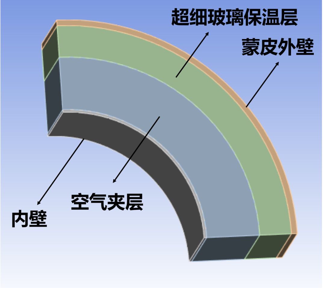 # 几何体-材料映射字典(键:几何体名称,值:ANSYS材料库名称)mat2geo_dict = { "inner wall": "Mag2Al", # 内壁 -> 铝镁合金 "insulation1": "air", # 空气夹层 -> 空气 "insulation2": "glass", # 超细玻璃保温层 -> 超细玻璃 "outer wall": "al" # 外壁 -> 软铝}