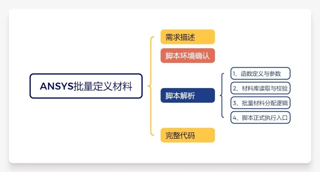 # -*- coding: utf-8 -*-"""ANSYS Mechanical 批量材料定义脚本 (Python 2.7)功能:根据几何体-材料映射字典,自动校验材料并批量分配作者:小郭老师日期:2025-11-02版本:V1.0"""def mat_definition(mat2geo_dict): """ 批量材料分配函数 参数:mat2geo_dict - 几何体-材料映射字典(dict类型) 返回:isExist_mat - 材料存在性校验结果(bool类型:True=所有材料存在,False=存在缺失材料);missing_mats - 缺失的材料 """ # 步骤1:获取当前Model中已加载的所有材料名称(从Materials树中读取) mat_lib = [mat.Name for mat in Model.Materials.Children] # 提取材料名称列表 print "当前ANSYS材料库中已加载的材料:%s" % mat_lib # 步骤2:提取映射字典中所需的所有材料(去重) mat_needs = list(set(mat2geo_dict.values())) # set去重后转list print "本次批量分配所需的材料:%s" % mat_needs # 步骤3:校验材料存在性 isExist_mat = True missing_mats = [] for need_mat in mat_needs: if need_mat not in mat_lib: isExist_mat = False missing_mats.append(need_mat) # 步骤4:根据校验结果执行操作 if isExist_mat: print "\n=== 所有材料已存在,开始批量分配 ===" for geo_name, target_mat in mat2geo_dict.items(): # 遍历字典项 for part in Model.Geometry.Children: # 遍历部件 for body in part.Children: # 遍历几何体 if geo_name in body.Name: # 名称匹配 body.Material = target_mat # 核心分配操作 print "分配成功:几何体「%s」→ 材料「%s」" % (body.Name, target_mat) print "=== 批量材料分配完成 ===" else: print "材料缺失,分配终止!缺失的材料:%s" % missing_mats print "解决方案:1. 进入Engineering Data模块;2. 补充材料" return isExist_mat, missing_mats# ---------------------- 脚本执行入口 ----------------------# 定义几何体-材料映射字典mat2geo_dict = { "inner wall": "Mag2Al", "insulation1": "air", "insulation2": "glass", "outer wall": "al"}# 执行分配函数mat_check_result, missing_mats = mat_definition(mat2geo_dict)# 校验失败时终止if not mat_check_result: raise Exception("材料缺失,脚本终止执行")