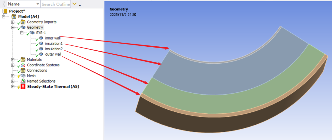 # 定义几何体-材料映射字典mat2geo_dict = { "inner wall": "Mag2Al", "insulation1": "air", "insulation2": "glass", "outer wall": "al"}# 执行分配函数mat_check_result = mat_definition(mat2geo_dict)# 校验失败时终止if not mat_check_result: raise Exception("材料缺失,脚本终止执行")