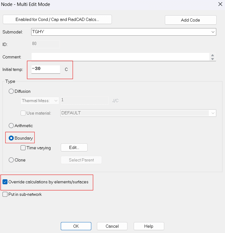 按钮,弹出框选择节点,进入节点编辑界面,复选Override calculation by elements/surfaces,选择Boundary,设置初始温度即可设置温度边界(此温度即为边界温度),边界节点以四面体显示(普通面节点以球形显示),注:此时若修改模型节点数量,则温度边界节点会消失,初始温度也会改变,需要重新设置