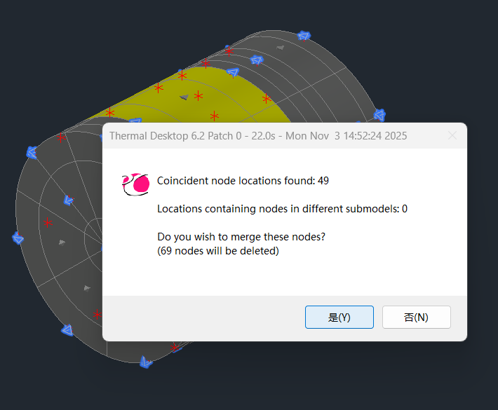 ,设置容差,此时模型会显示多少节点会合并,模型合并节点处会以红点显示,合并节点后的模型可认为是一体的,无需再次建立导热关系,注:若合并完节点模型更改节点数量,移动模型都会导致合并节点的失效,且此时的模型节点名称会发生变化,故修改模型前最好将合并的节点分开,使用节点分散按钮