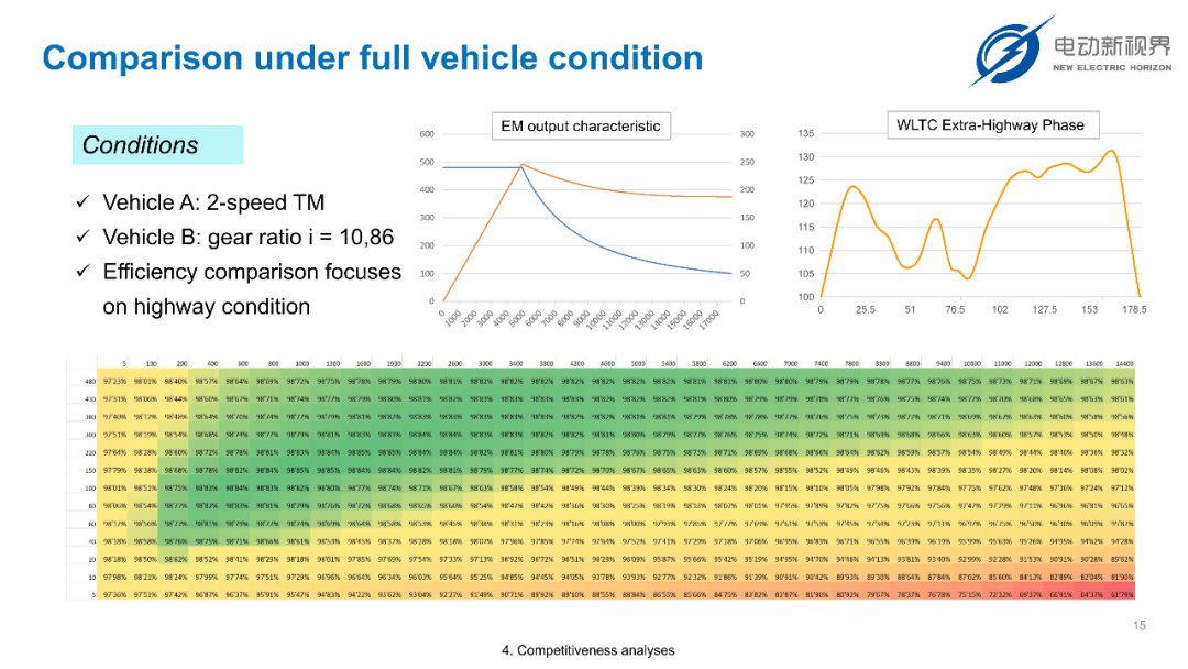 一款技术方案好不好,最终要看 “实车表现” 和 “成本”。深视咨询的团队把 “两挡变速箱车型(车辆 A)” 和 “单挡变速箱车型(车辆 B,传动比 10.86)” 做了全面对比,结果很亮眼。