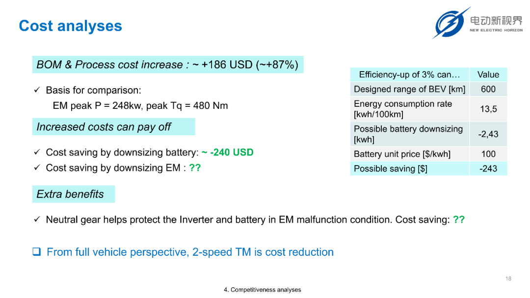 简单算一笔账:186 美元(增量成本)-243 美元(电池省的钱)- 电机省的钱 =净成本降低。也就是说,从 “全车角度” 看,两挡变速箱不仅不贵,还能帮车企 “降本”。