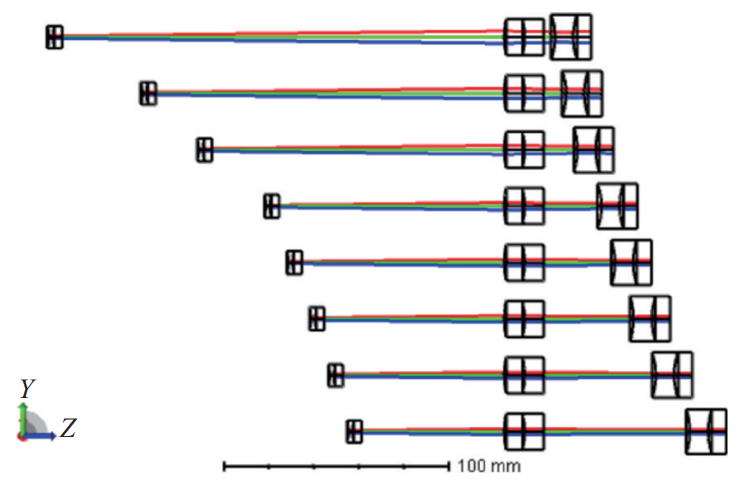 光路搭建:按上述参数创建“物面-变倍组-固定组-补偿组-像面”的完整光路,如图2所示,直观呈现不同扩束比下的系统结构;