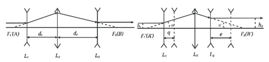 系统采用“变倍组(L₁)-固定组(L₂)-补偿组(L₃)”的三组元架构,如图1所示,通过机械调整两组元间距实现变倍: