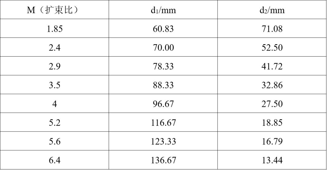 首先确定三组元初始焦距:变倍组(L₁)-20mm、固定组(L₂)50mm、补偿组(L₃)-60mm。针对“覆盖典型应用场景”需求,选取8个代表性扩束比(1.85×~6.4×),通过公式计算各组元初始间距(d₁、d₂),结果如下表所示: