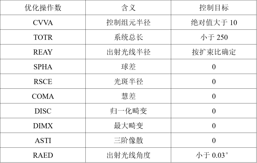 为解决初始结构的问题,以“紧凑化、低像差、高准直”为目标,通过Zemax多重结构优化功能,对系统参数进行全方位调整。