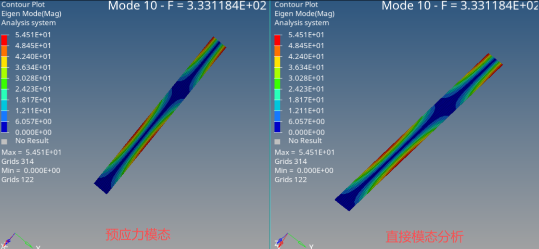 本案例中前4阶模态两种分析基本一致,之后的模态频率或振型出现明显区别