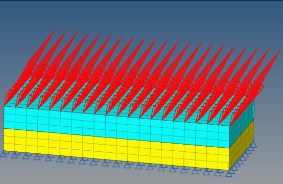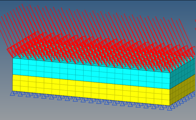 下面以一个例子解读,建立一个体网格模型,两个模型刚好零贴,底面全约束,上面进行倾斜力添加