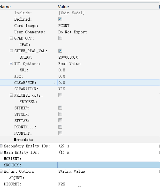 接触关系如下,接触方式是N2S,法向接触刚度设置2000000N/mm
