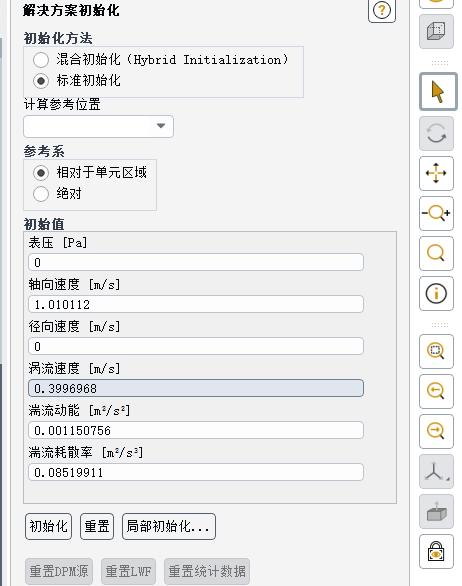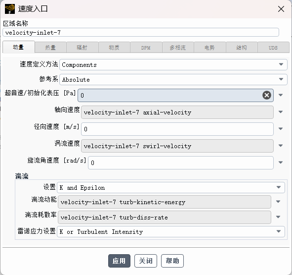 对速度入口边界进行设置,速度设置为components,轴向速度与涡流速度选择prof文件,其次对压力出口边界进行设置,表压选择为0Pa,具体设置如下图:
