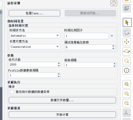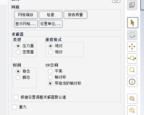首先导入网格,然后勾选为稳态计算,并选择压力基求解器。并选择带旋流的轴对称选项。