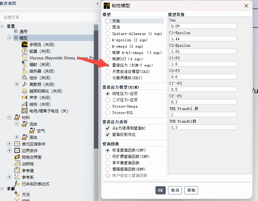 本案例所选用的模型为雷诺应力湍流模型,相关设置如下图所示: