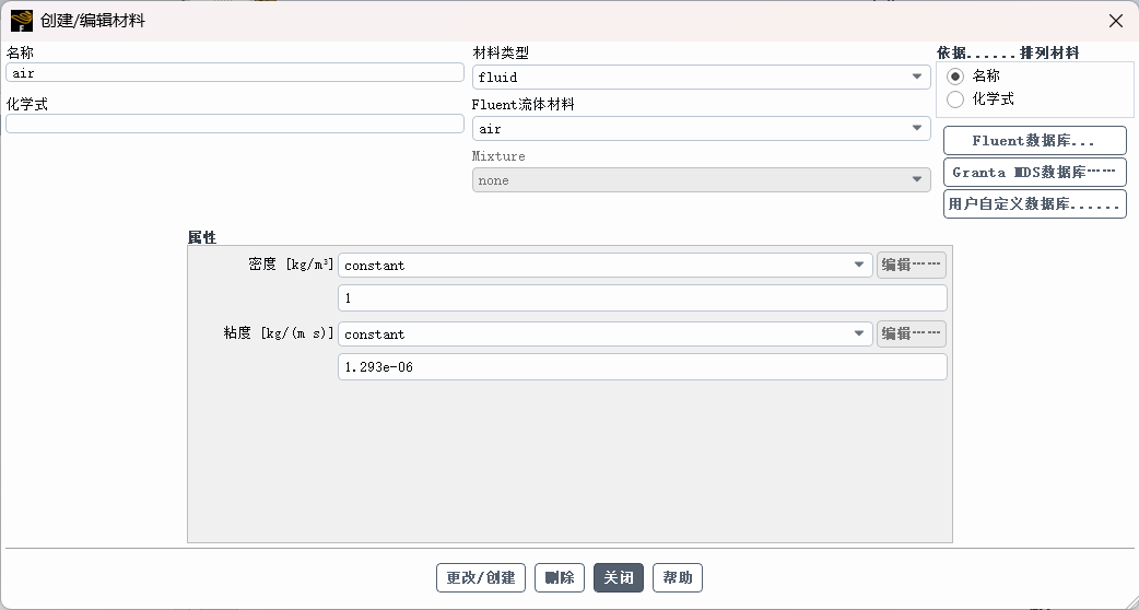 依据相关文献中的数据,对材料进行设置,密度设置为1,粘度设置为1.293e-06,相关设置如下如所示: