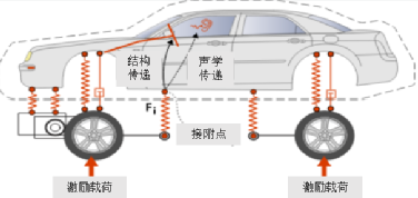 TPA分析一般用于整车级分析,如整车路噪或加速噪声等,通过传递路径分析可以找出对响应关注频率较大的路径或响应面。主要是从整车的角度进行考察,即激励通过各条可能的路径传递给车内,包括结构声以及空气声。在中低频率下,主要以结构声为主;在高频率,如1000Hz以上,主要以空气声传递为主,本文主要从结构声的传递路径进行分析,如图20.1所示。
